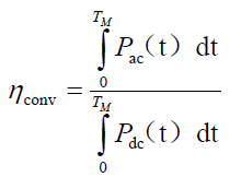 轉(zhuǎn)換效率是指在規(guī)定的測試周期TM內(nèi),光伏逆變器在交流端口輸出的電能與在直流端口輸入的電能的比值,計算公式如下所示: