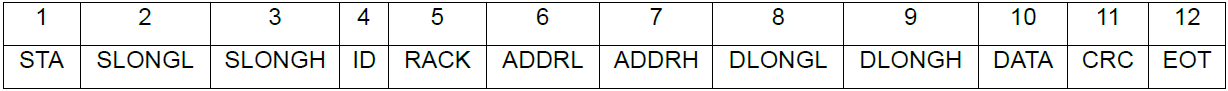SLONGL、SLONGH:SLONGH其后指令字節(jié)數(shù),從STA開(kāi)始,以十六進(jìn)制雙字節(jié)表示,低字節(jié)在前,高字節(jié)在后。如果其后字節(jié)數(shù)為8個(gè),則SLONGL SLONGH寫入:08 00,如果其后字節(jié)數(shù)為20個(gè),則SLONGL SLONGH寫入:14 00。